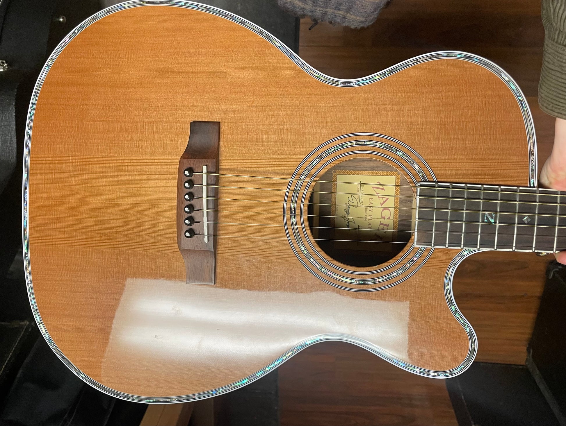 Zager Pro Series guitars play a little easier and sound just a little more powerful than our regular series instruments. The woods are aged longer. The finish is applied thinner so the sound board moves half a millimeter more when the strings are hit providing a deeper bass response. Each piece of abalone and pearl is laid by hand and in combination with gold Grover tuners that “pop” to the eye on the red cedar finish. Most customers buying our 80 Series are touring artists and veteran musicians coming from high level Martin, Taylor, Santa Cruz and Gibson. Unlike our 20 and 50 Series guitars that use spruce and mahogany giving them a punchy bright character, the 80’s are constructed using East Indian rosewood and red cedar giving them a deeper, richer, more mellow response.