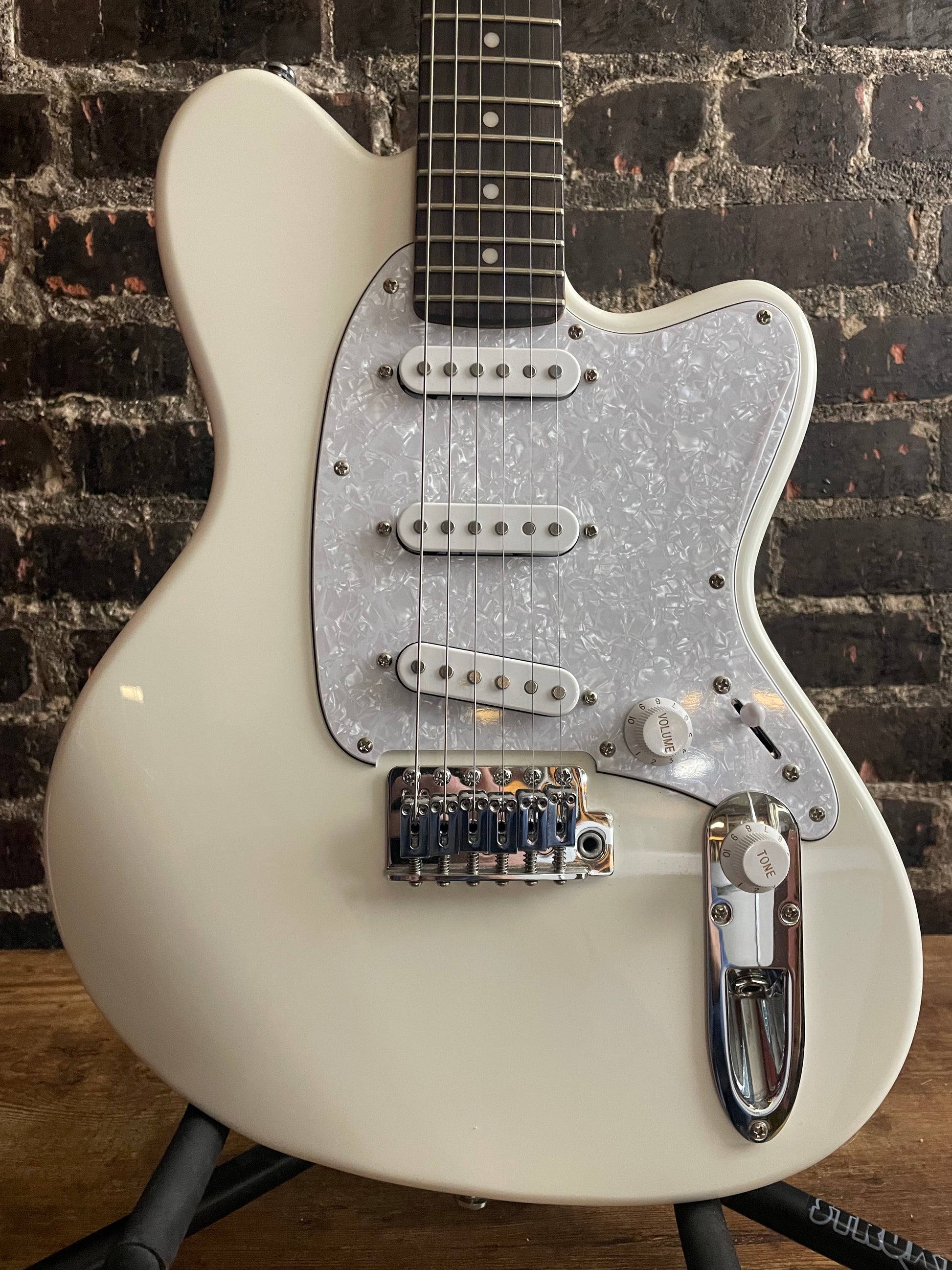 This instrument has signs of use throughout (scratches, swirls, hardware patina, etc.), but is fully functional and plays/sounds great. Missing tremolo arm, does not come with a case or bag.