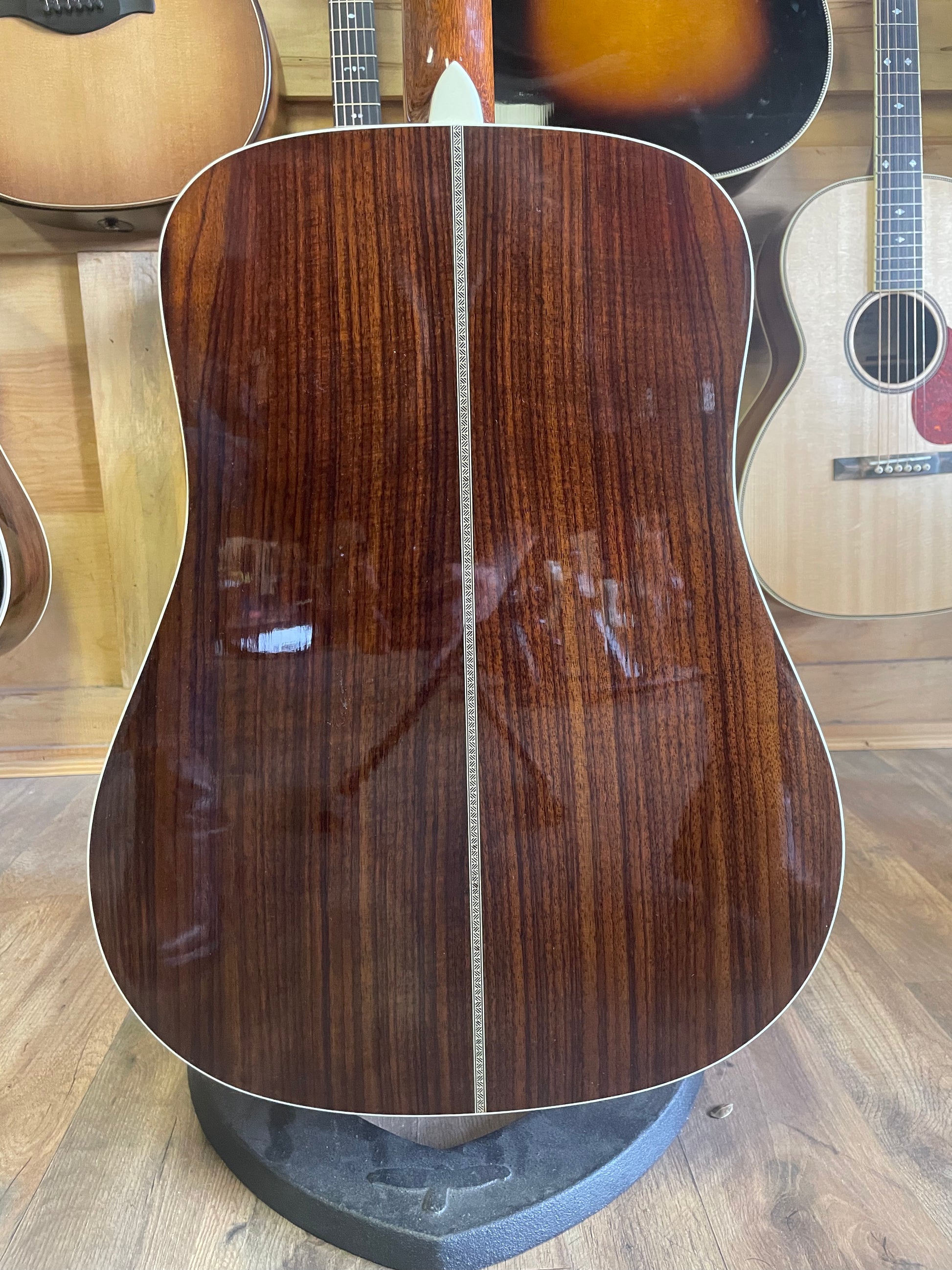 - Solid Indian rosewood back and sides with center strip of delicate wood marquetry